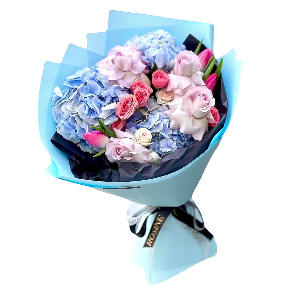 3 dal ortanca 4 dal pembe çardak gül, 3 dal pembe lale 2 dal beyaz lale 3 dal fuşya çardak gül, 3 dal krem çardak güllerden hazırlanan Azure mavi rengin büyüsüyle özel günlerin vazgeçilmezidir.