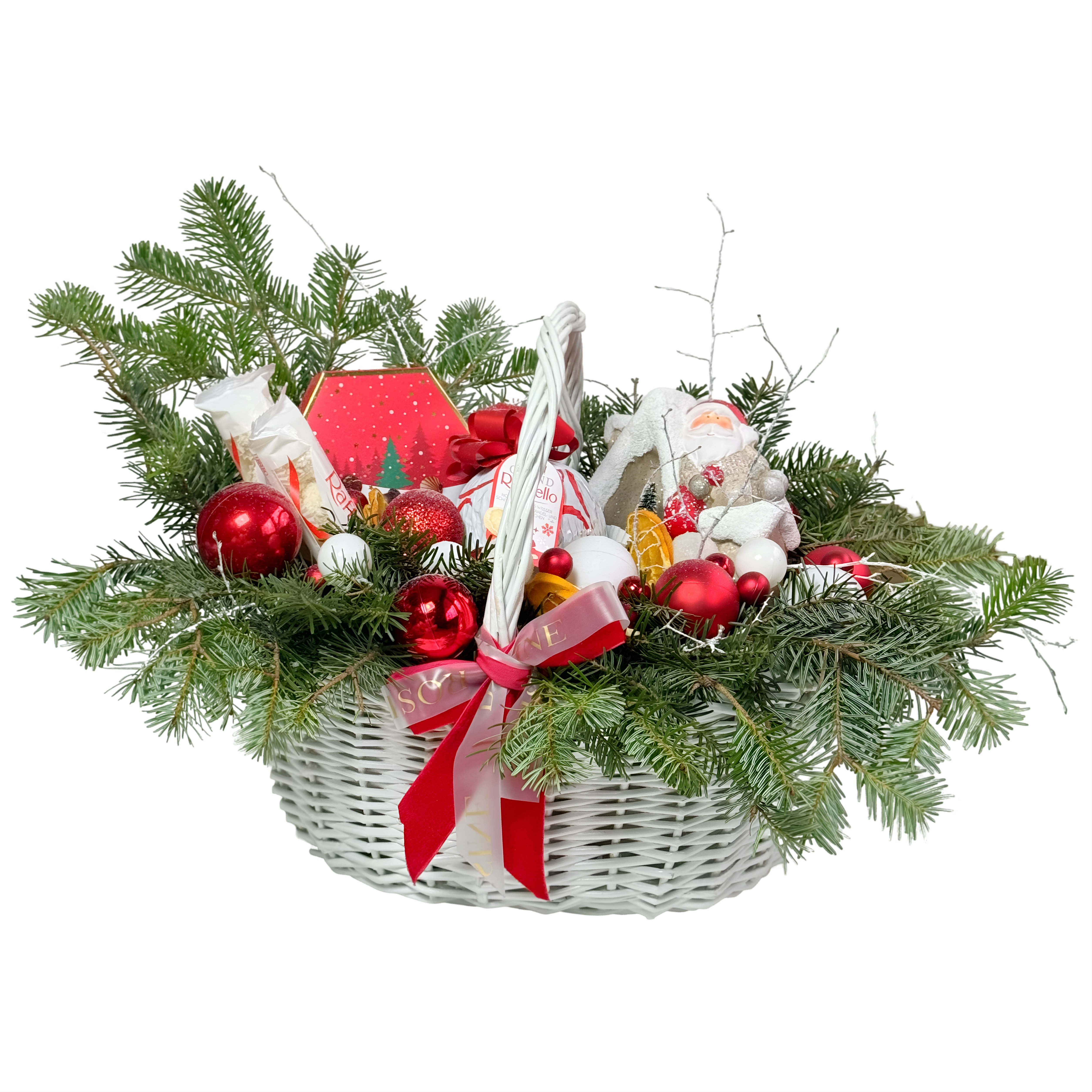 Yeni yılın sıcak ve neşeli ruhunu yansıtan bu özel yılbaşı sepeti, taze çam ağacı dalları ve özenle seçilmiş yılbaşı süsleriyle hazırlanmıştır. Kırmızı–beyaz tonların uyumu, doğal dokularla birleşerek hem şık hem de davetkâr bir görünüm sunar.