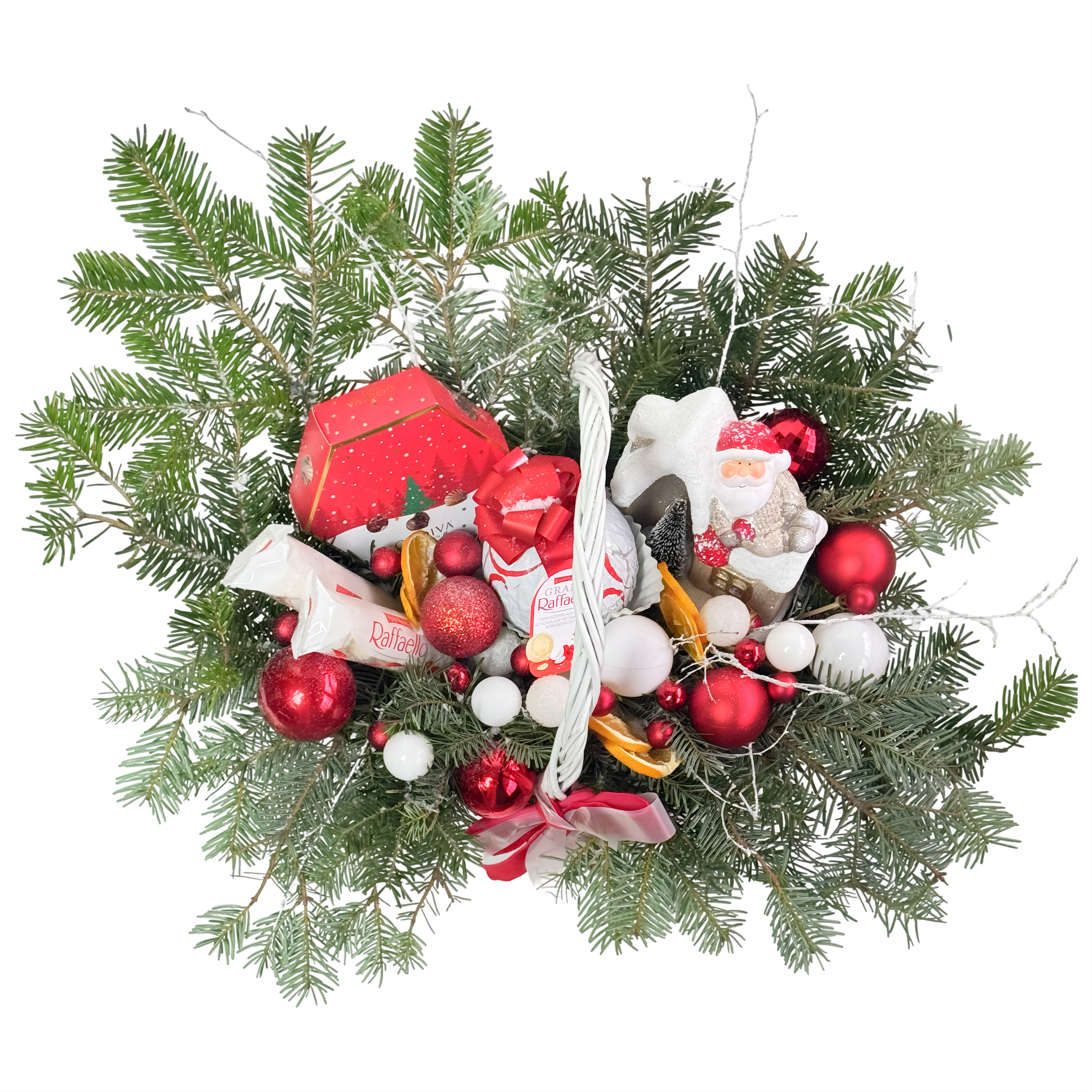 Aranjman içerisinde 2 adet 3’lü Raffaello, 1 adet Grande yuvarlak Raffaello, Noel evi, yılbaşına özel Godiva çikolata ve kurutulmuş portakal dilimleri yer alır. Doğal çam dalları ve yılbaşı süsleriyle zenginleştirilen bu sepet; yılbaşı sofraları, ev dekorasyonu veya sevdiklerinize lezzet dolu bir yeni yıl hediyesi olarak ideal bir tercihtir.