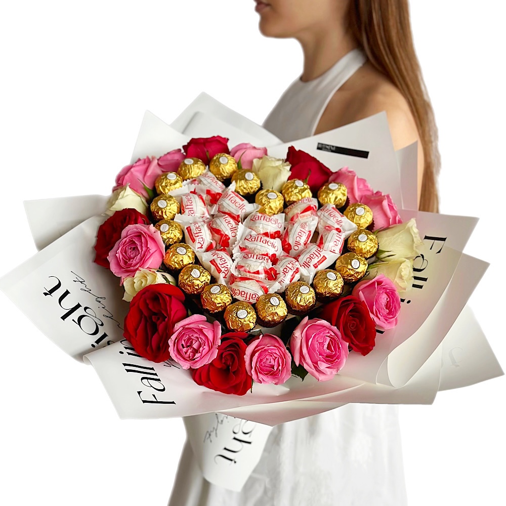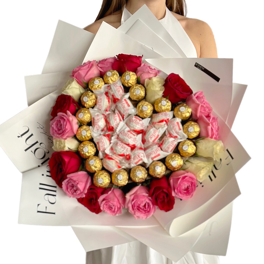 Günümüzün trendlerini size sunarak sevdiklerinizi mutlu etmek için tüm çiçek tasarımlarını sevgi ve tutkuyla hazırlıyoruz. Fuscia… Orta kısmı kalp şeklinde Ferrero ve Rafaello çikolatalarıyla kaplı, kenarları 21 adet pembe, kırmızı ve beyaz gülden oluşan Fuscia sevdikleriniz yüzünü güldürmek için hazırlandı.