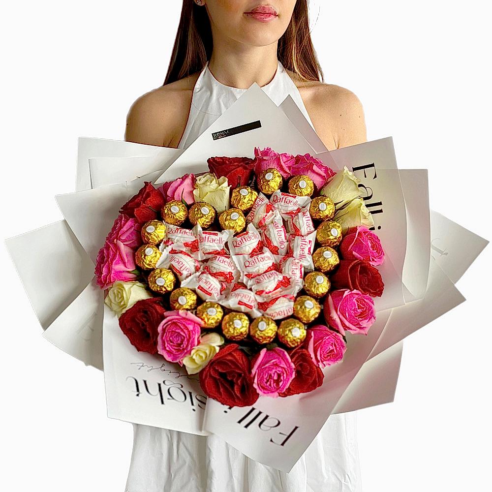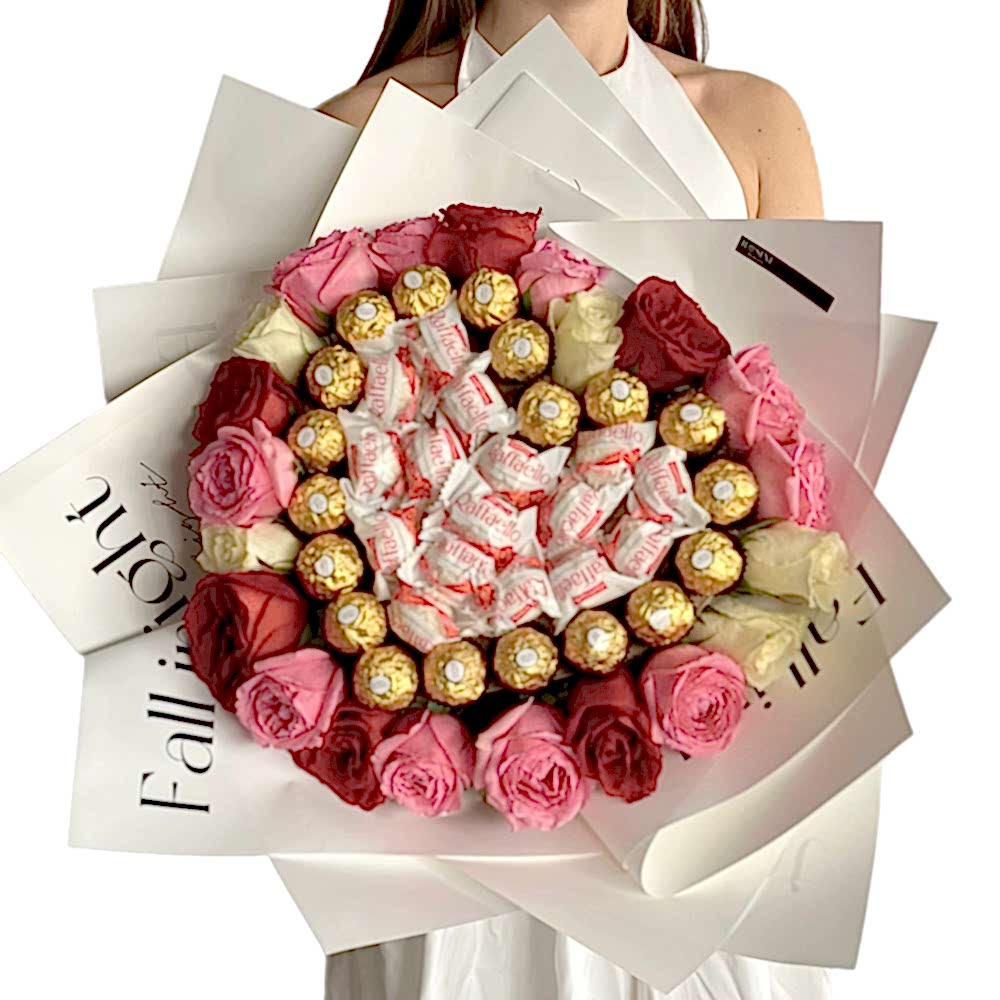 Günümüzün trendlerini size sunarak sevdiklerinizi mutlu etmek için tüm çiçek tasarımlarını sevgi ve tutkuyla hazırlıyoruz. Fuscia… Orta kısmı kalp şeklinde Ferrero ve Rafaello çikolatalarıyla kaplı, kenarları 21 adet pembe, kırmızı ve beyaz gülden oluşan Fuscia sevdikleriniz yüzünü güldürmek için hazırlandı.