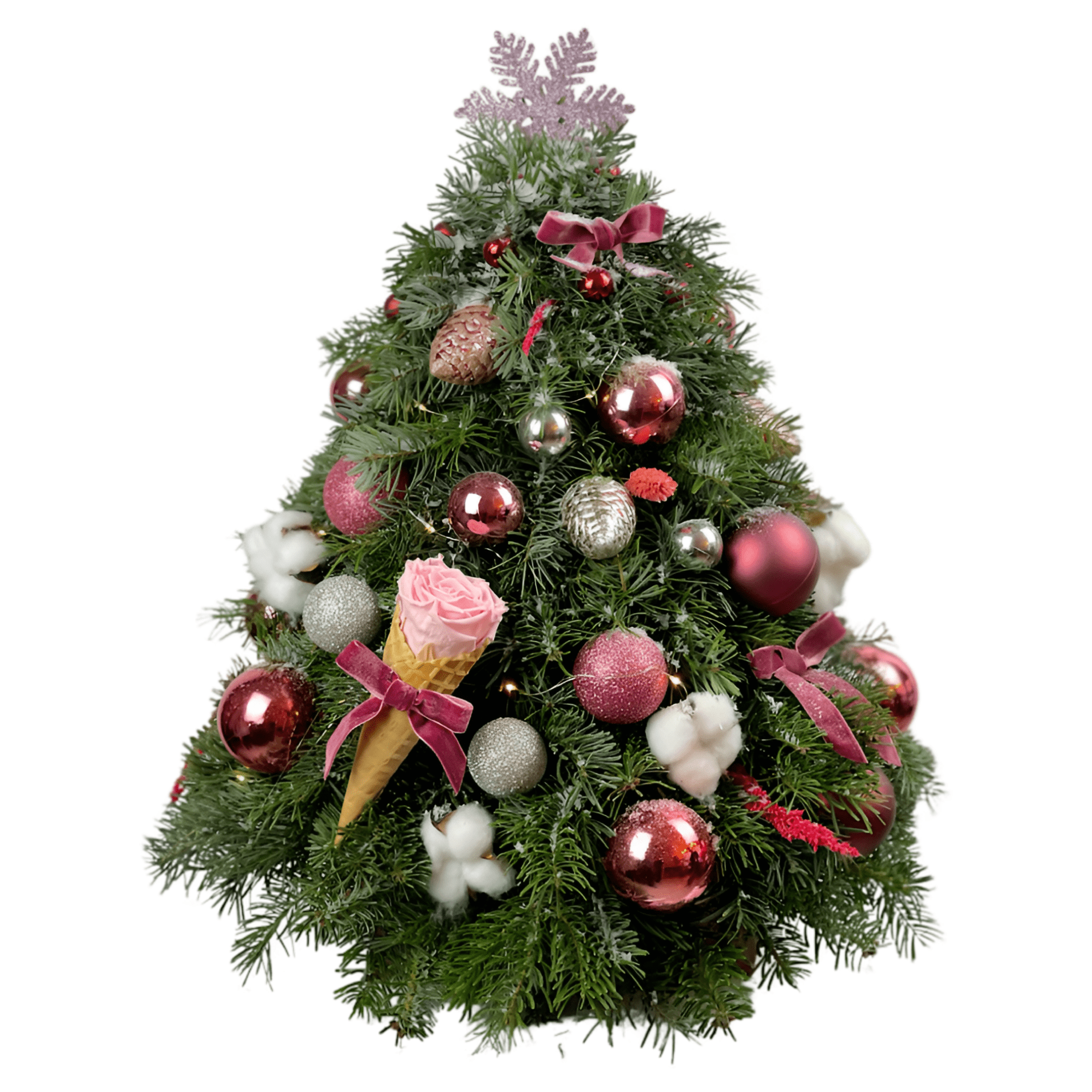 Yeni yılın habercisidir çam ağacı… Özellikle aralık ayında başlayan çam ağacı süsleme heyecanı…Hem sevinç, hem de mucizeleri beklediğimiz zamandır… Rosine çam ağacı sadece yılbaşı süslerle yetinmedi ve külahta solmayan gül de eklenildi. Pembe tonda oluşan çam ağacı isteğiniz üzere farklı tonlarda ayarlanabilir.