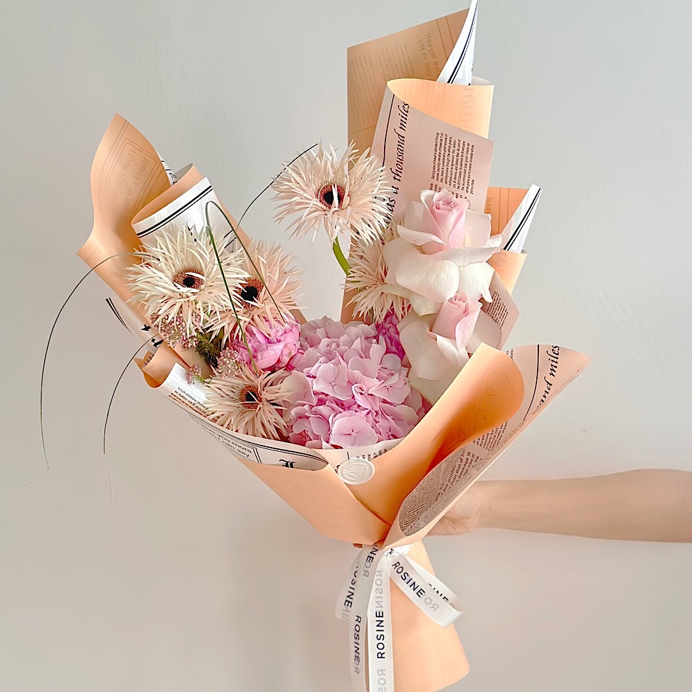 Bu zarif buket, tek dal pembe ortanca, iki dal gül, dört dal gerbera ve bir dal ozothamnus ile oluşturulmuştur. Bu kombinasyon, bu buketi gerçekten özel kılan birçok çiçeği bir araya getirmektedir.