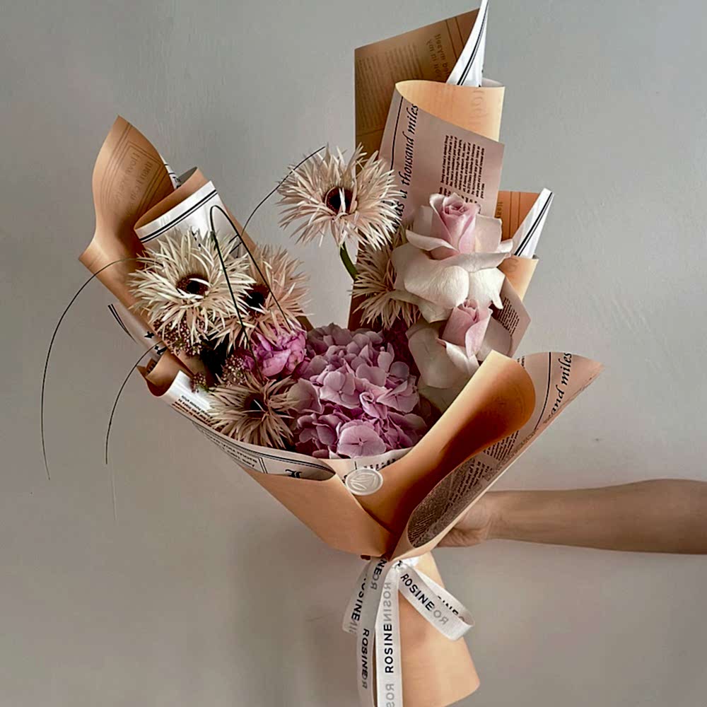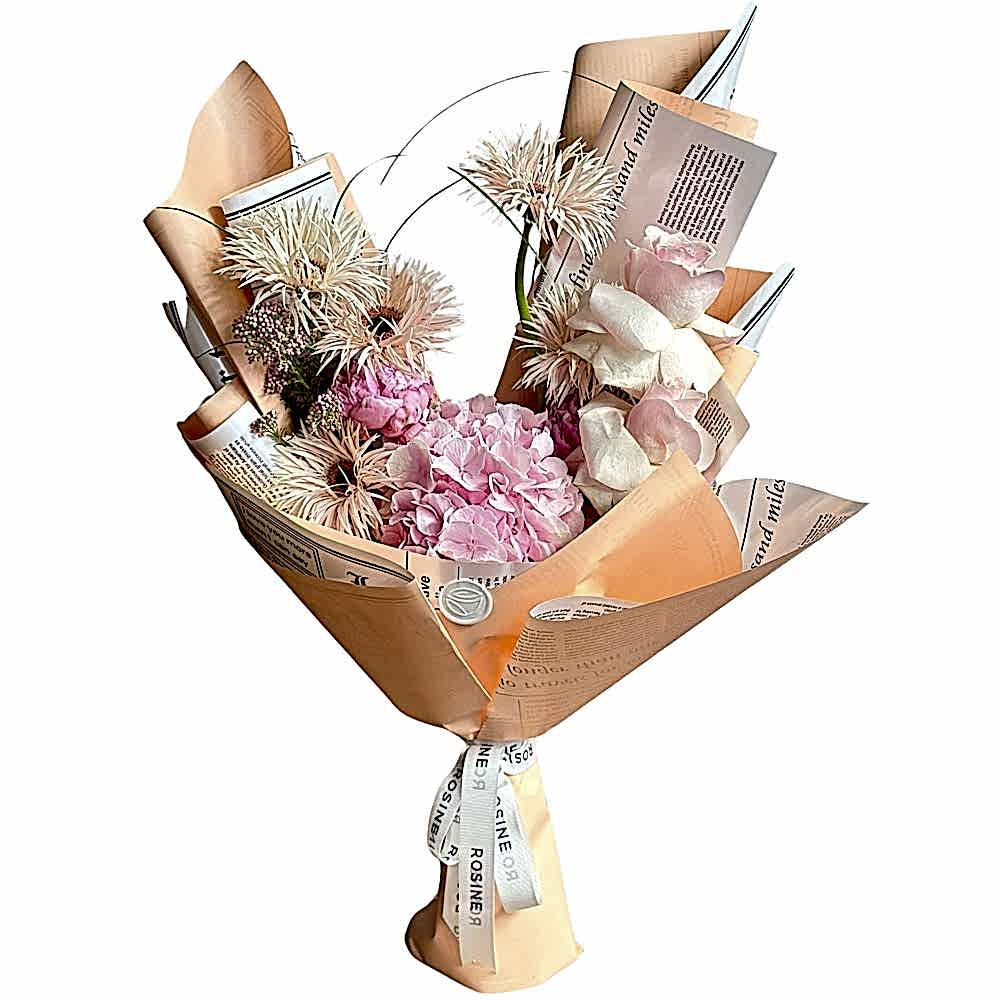 Bu zarif buket, tek dal pembe ortanca, iki dal gül, dört dal gerbera ve bir dal ozothamnus ile oluşturulmuştur. Bu kombinasyon, bu buketi gerçekten özel kılan birçok çiçeği bir araya getirmektedir.
