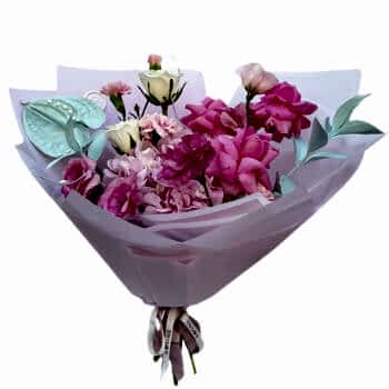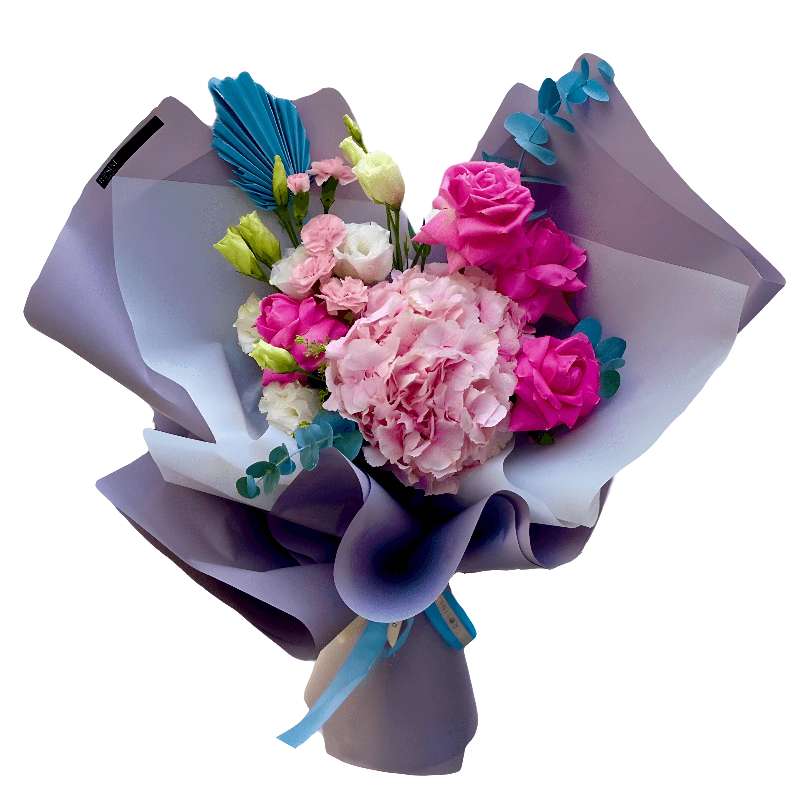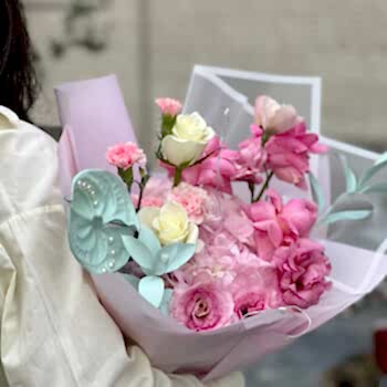 Sparkle buketi 1 dal pembe ortanca, 4 dal pembe gül, 3 dal beyaz lisianthus, 3 dal ada karanfil, 3 dal okaliptüs, 1 dal kuru çiçekten hazırlanmıştır.