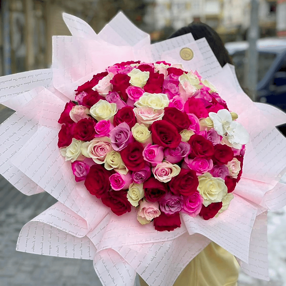 Klasik 101 adet gül buketine Rosine dokunuşları…Beyaz, kırmızı, fuşya, pembe güllerin karışımıyla ortaya çıkan romantik ve göz alıcı buketimiz aşkı simgeliyor. Renklerin ahengi, ona karşı duyduğunuz tüm duygularınızı aktarmaktadır. Aşkınızı tarif etmenin en güzel yolu Splash buketidir.