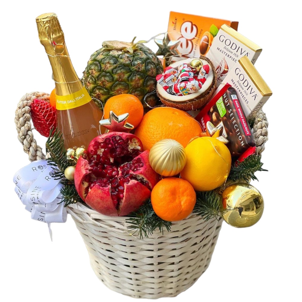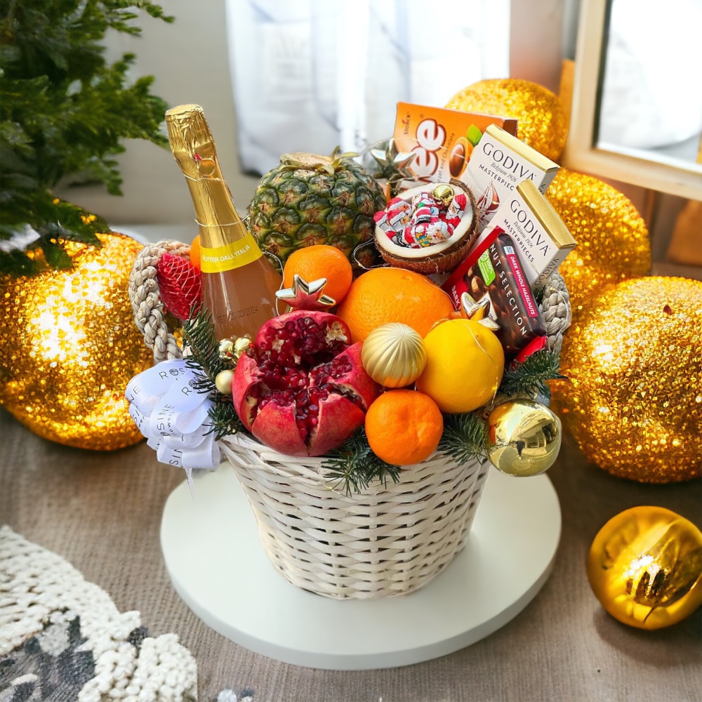 2024’ün muhteşem sepeti. İçerisinde alkolsüz simli içecek, portakal, nar, mandalina, ananas, Godiva çikolata, Ritter sport çikolata, Toffifee, çam ağacı dalları, yılbaşı süsleri var.