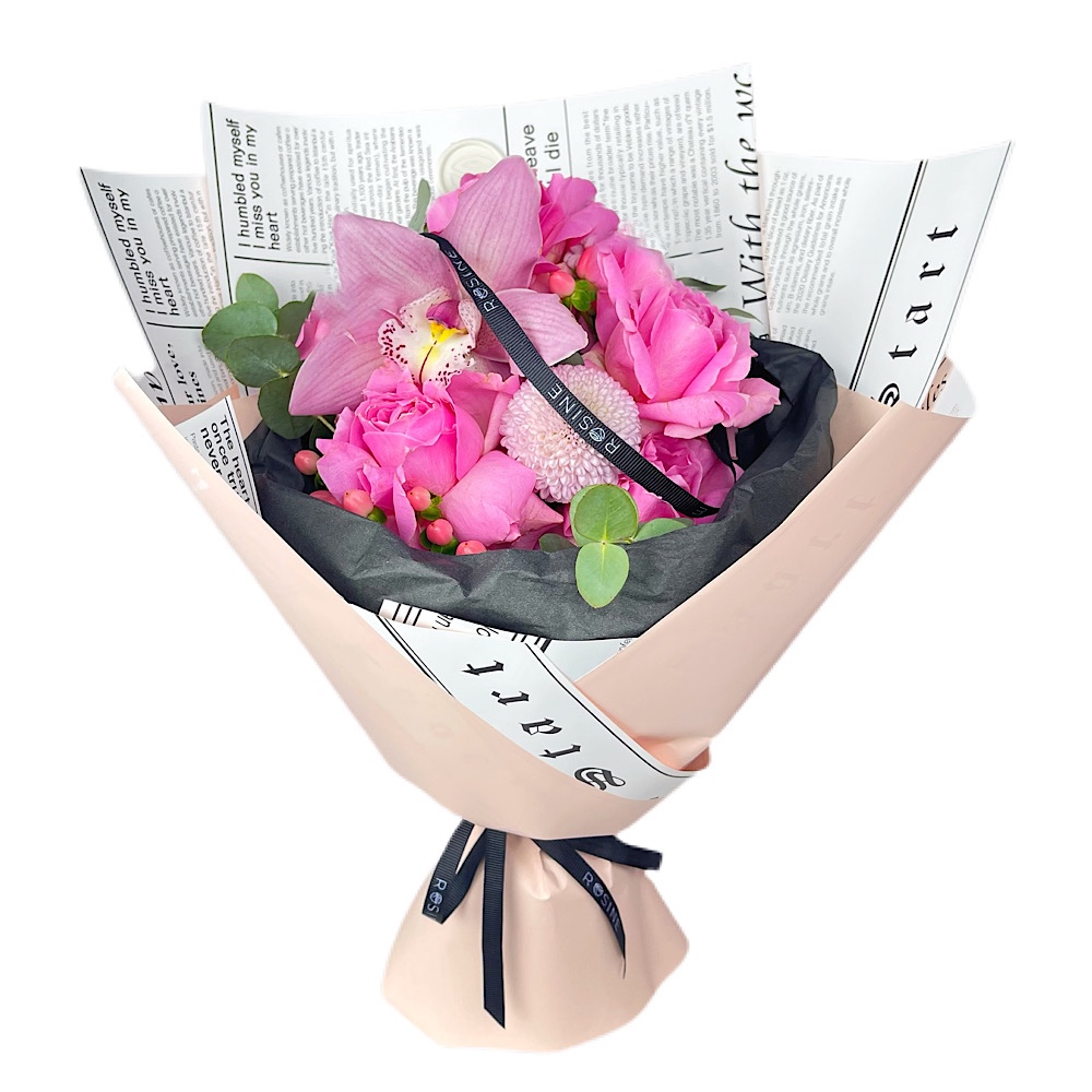 Vintage pink buketi içerisinde 5 adet pembe ithal gül, 1 dal cymbidium, 3 dal pembe hypericum, 3 dal okaliptüs bulunmaktadır. Tüm bu çiçekler nostaljik çift taraflı su geçirmez kağıtla kaplıdır. Kağıtın bir tarafı gazete desenli, bir tarafı tek renk pembedir. Buketin iç kısmı siyah renk pelur kağıtla kaplanmıştır. Markamızın logosu bulunduğu kurdele ve mum sticker bukete güzellik katmaktadır. Bu buket hem sevgiliye, hem arkadaşa, hem de tüm sevdiklerinize göndermeniz için tasarlanmıştır.
