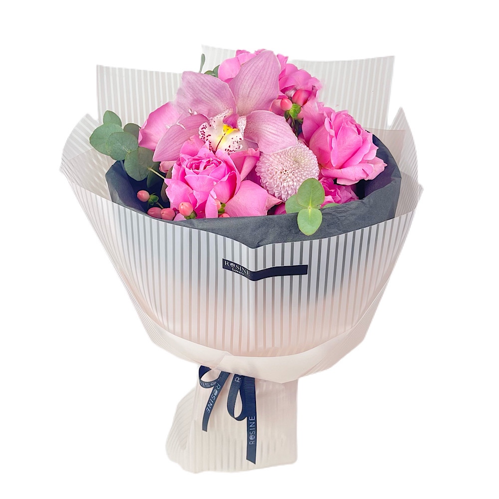 Wish buketi içerisinde 5 adet pembe ithal gül, pembe hypericum, 3 dal okaliptüs bulunmaktadır. Tüm bu çiçekler pembe şeritli su geçirmez kağıtla kaplıdır. Buketin iç kısmı siyah renk pelur kağıtla kaplanmıştır. Markamızın logosu bulunduğu kurdele ve sticker bukete güzellik katmaktadır. Bu buket hem sevgiliye, hem arkadaşa, hem de tüm sevdiklerinize göndermeniz için tasarlanmıştır.