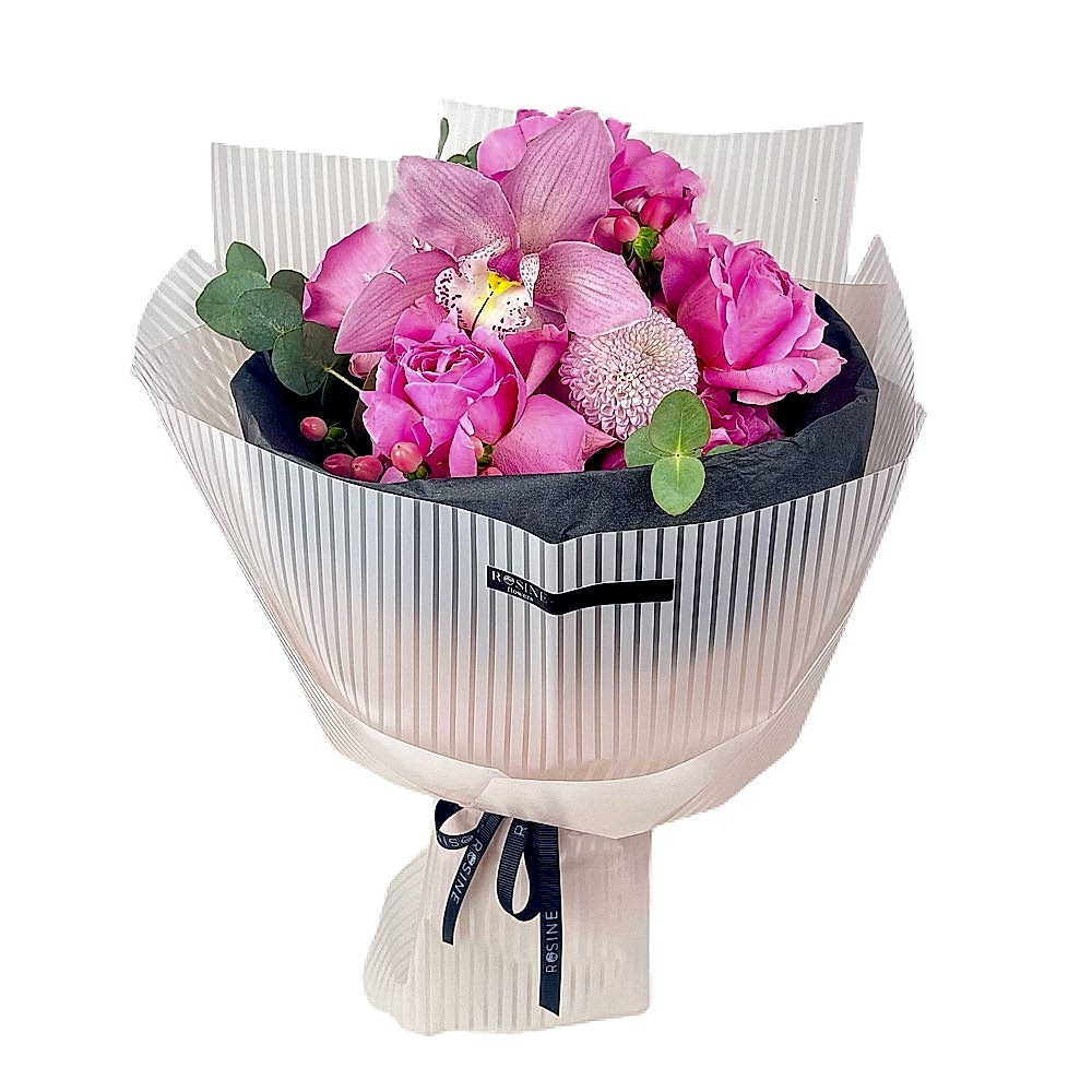 Wish buketi içerisinde 5 adet pembe ithal gül, pembe hypericum, 3 dal okaliptüs bulunmaktadır. Tüm bu çiçekler pembe şeritli su geçirmez kağıtla kaplıdır. Buketin iç kısmı siyah renk pelur kağıtla kaplanmıştır. Markamızın logosu bulunduğu kurdele ve sticker bukete güzellik katmaktadır. Bu buket hem sevgiliye, hem arkadaşa, hem de tüm sevdiklerinize göndermeniz için tasarlanmıştır.